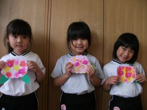 折り紙をおって飾り切りをし、ひとつひとつ違う形が出来ていて子ども達も楽しんでいました😉