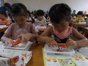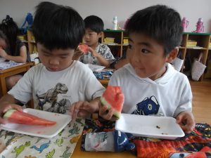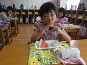 ゲームあそびが終わると最後はクラスのみんなでスイカを食べました🍉