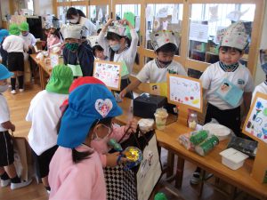 買い物に行く人は年少さんと一緒に手を繋いでいきました。