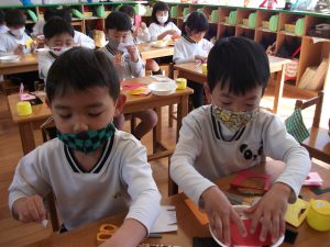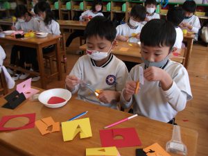 「こまった顔の鬼にしようかな~」「僕は怖くて口が大きい鬼にする~!」「眉毛は太い方がかっこいいかな!」と思い思いに作っていた子ども達。