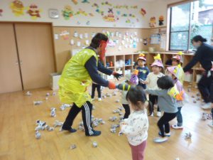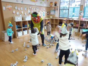 広告紙を丸めた豆で、大~きな鬼を見事に撃退しました👹💨