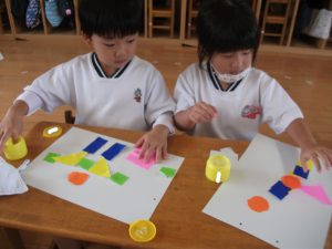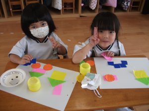 ◯、△、▢に切ったものを今度は画用紙に貼っていきました!