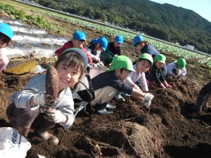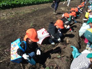 スコップを取りだし、いざ芋を掘り始めると「え~?どこにある?」「先生、お芋の頭がすこし見えてきたよ!!」と目をキラキラさせて話していました😁✨✨