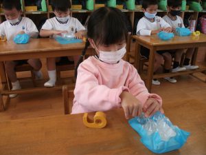 ゆりぐみさんは、卵パックの中にいれるエサを作りました。
