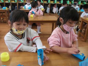 ですが、年中さんみんなは元気にお店屋さんごっこに向け、どんどん品物づくりをがんばっていますよ~☺☺