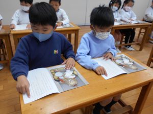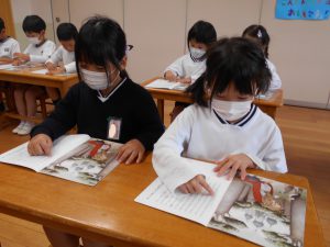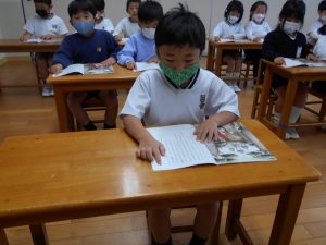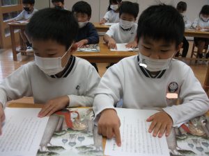 指で文字をなぞりながら真剣に読む子どもたちの様子です💖