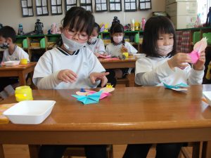 折り紙で、尺やえぼし、扇やかんむりを作り、