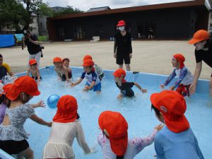 やっと入れたプール🥳【年中】2023/07/04 今日は何と!!やっとプールに入れました✨!! 「今日はプール入れるよね!?」「プールにお水入れてるー!!」 と朝から嬉しそうにしていた子どもたち😊 水着も自分たちで着替える事ができ、いつも以上に準備も早かったです!🤣 上田先生と一緒に楽しくすごしました🎶