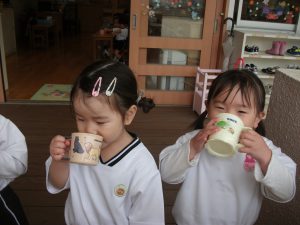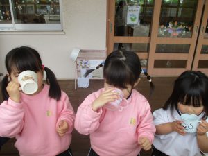 外遊びの後などにうがいをして、のどにいるバイキンさんをみんなでやっつけます💪💥