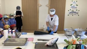 今日は給食センターに行って、ぶりの解体を見せてもらいました。