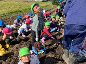 一生懸命に堀り、出てくるお芋に大興奮!!「見て!!大きいの!」「可愛いお芋もあったー!」と芋の大きさや形を見て楽しんでいました😊友達と力を合わせて引っ張る姿もたくさんで、どうやって食べようかと話をして盛り上がっていました🥰