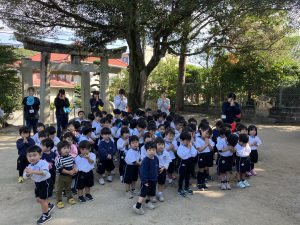 みんなで歩いて行き、どきどきわくわくな子どもたちでしたが、車に気をつけながら無事神社に到着!!ニ礼ニ拍手一礼でしっかりご挨拶をしました!手を合わせると、ぶつぶつと口を動かしながらお願いする姿も見られました☺️