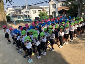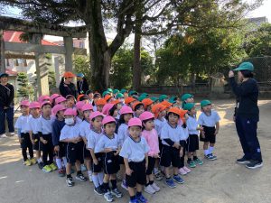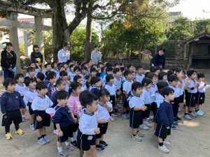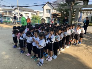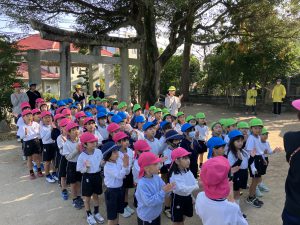 みんなで歩いて行き、どきどきわくわくな子どもたちでしたが、車に気をつけながら無事神社に到着!!ニ礼ニ拍手一礼でしっかりご挨拶をしました!手を合わせると、ぶつぶつと口を動かしながらお願いする姿も見られました☺️