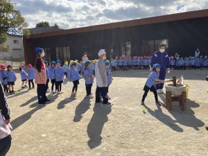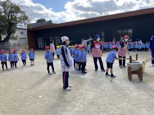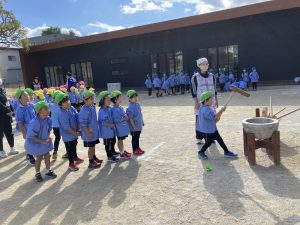もちつきは年長さんが!ドキドキな表情、気合いたっぷりな表情と色々な様子が見られましたが、みんな一生懸命ついてくれました😊その姿に「よいしょ!よいしょー!」とぱんださん、年少年中さんも掛け声を送りました✨