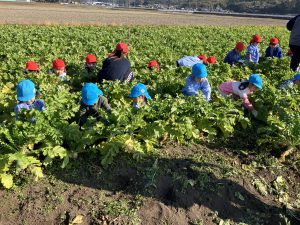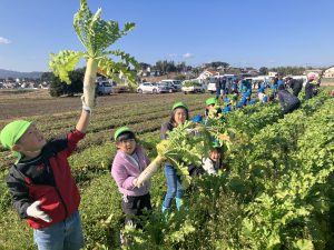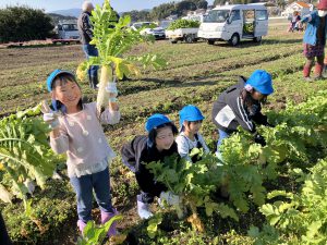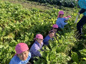 畑に到着すると、土から出ている沢山の大根の葉っぱにびっくり😳!!うねの間を歩くのも一苦労でした!大根を引っ張ってみると、思わず尻もちをつく姿も…!!みんな一生懸命に収穫し、色々な形や大きさの大根を見つけて楽しんでいました😊