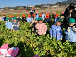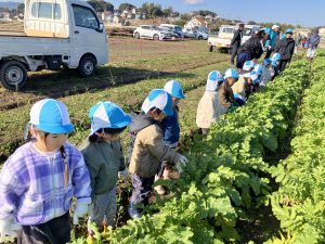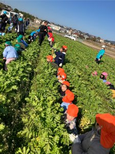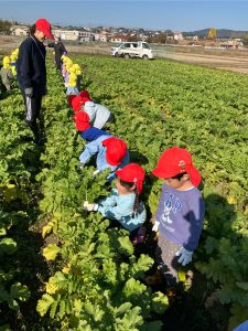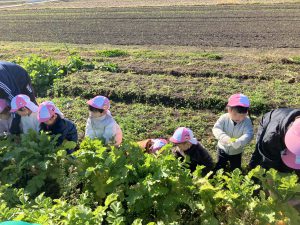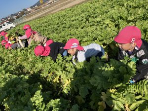 畑に到着すると、土から出ている沢山の大根の葉っぱにびっくり😳!!うねの間を歩くのも一苦労でした!大根を引っ張ってみると、思わず尻もちをつく姿も…!!みんな一生懸命に収穫し、色々な形や大きさの大根を見つけて楽しんでいました😊