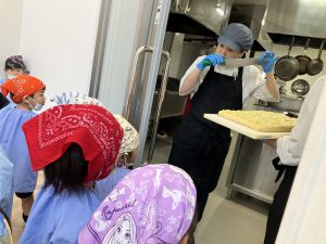 給食センターについて、マスクと三角巾を付けて、準備O.K