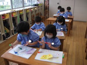 傘は自分の絵具を使って、デカルコマニーという技法に挑戦!