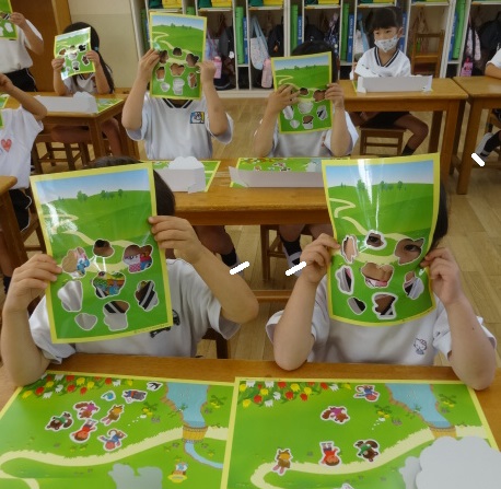 年中さんになると、シートを見て気付いたことを発表したり、シールを使ってお話を考えたりします!