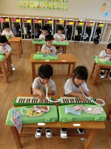 元気に遊んだ後は、鍵盤ハーモニカで♪かえるのうたに挑戦しました。