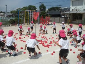 ♪アルプス一万尺の曲に合わせて踊り、玉入れをします!