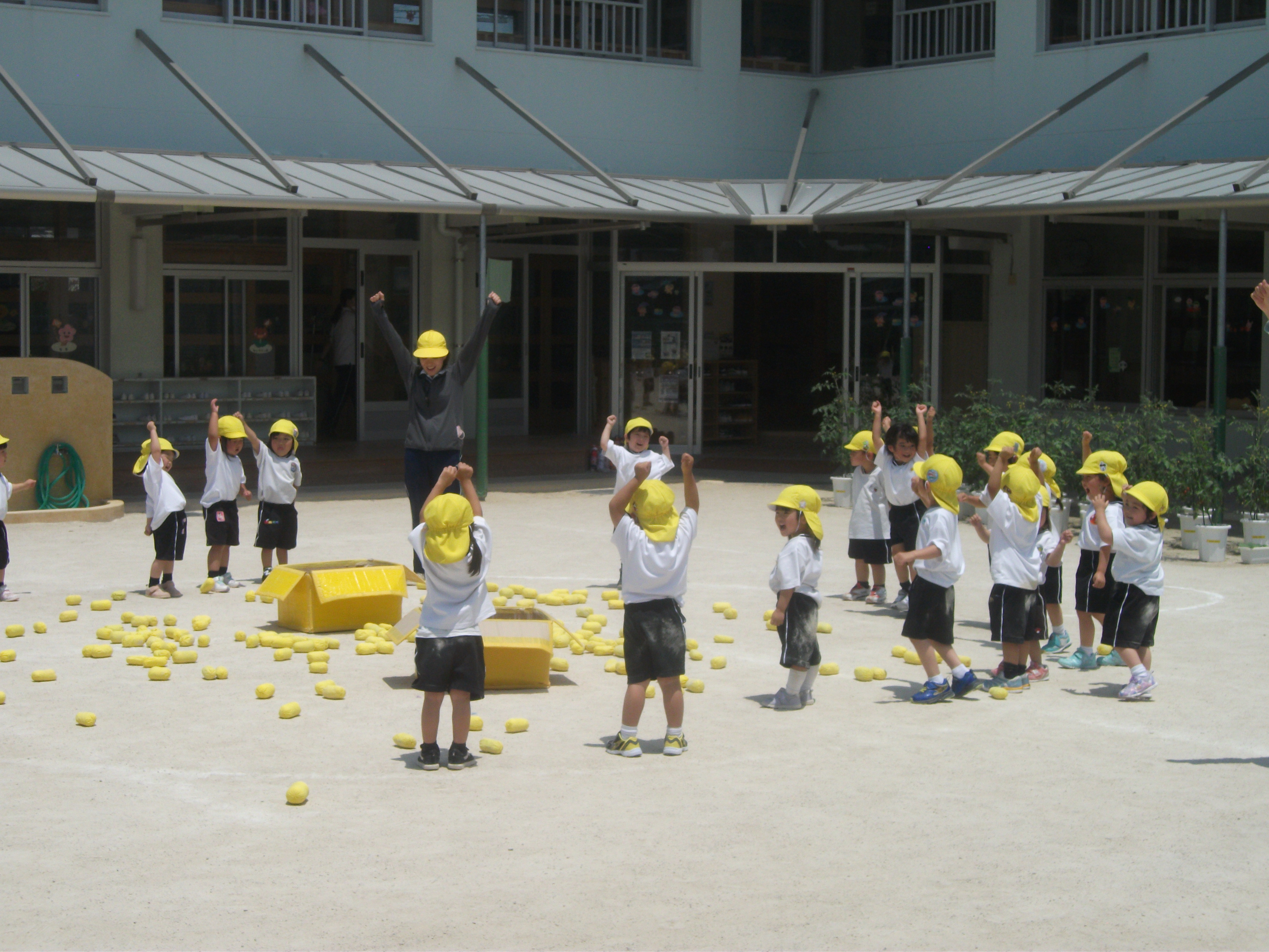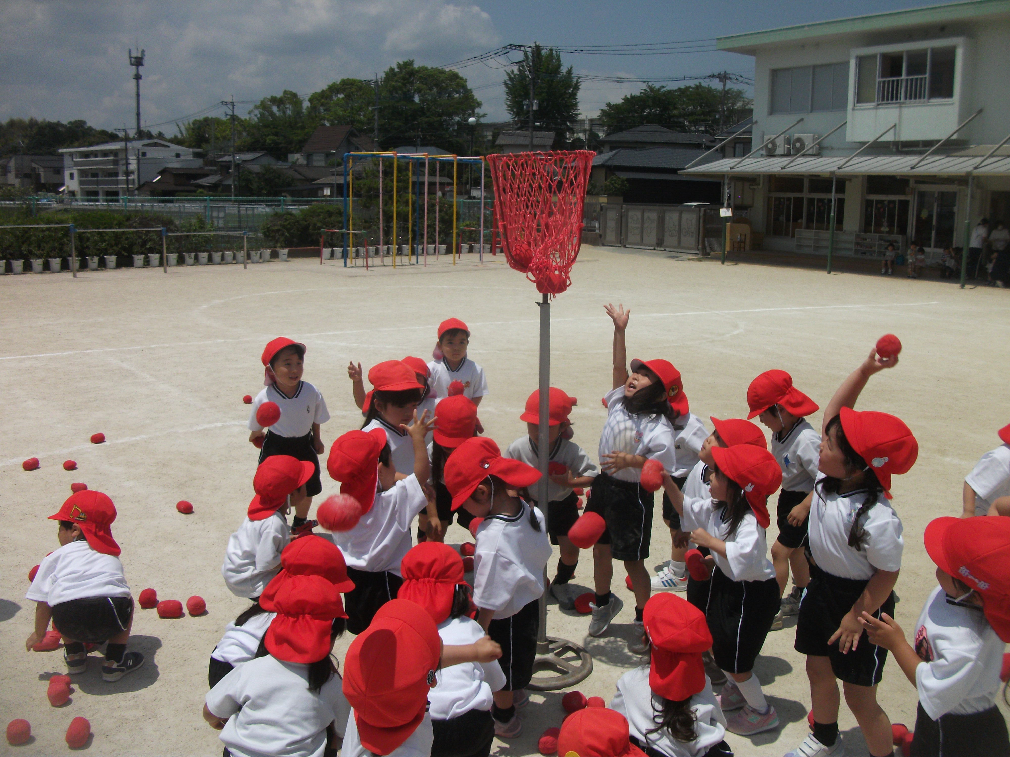 朝のお集りが終わったあと、園庭で年長さんが玉入れをしていました。