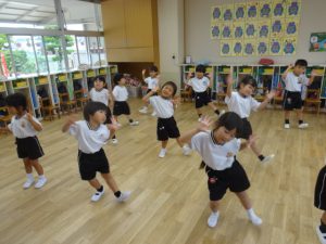 先日までお集まりの時に踊っていた“グーチョキパーマーチ”を子どもたちが踊ります💃