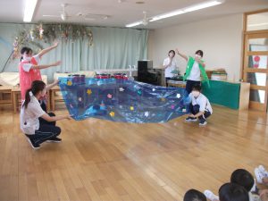 先生たちが織姫、彦星役になり、七夕の由来のお話をしました。