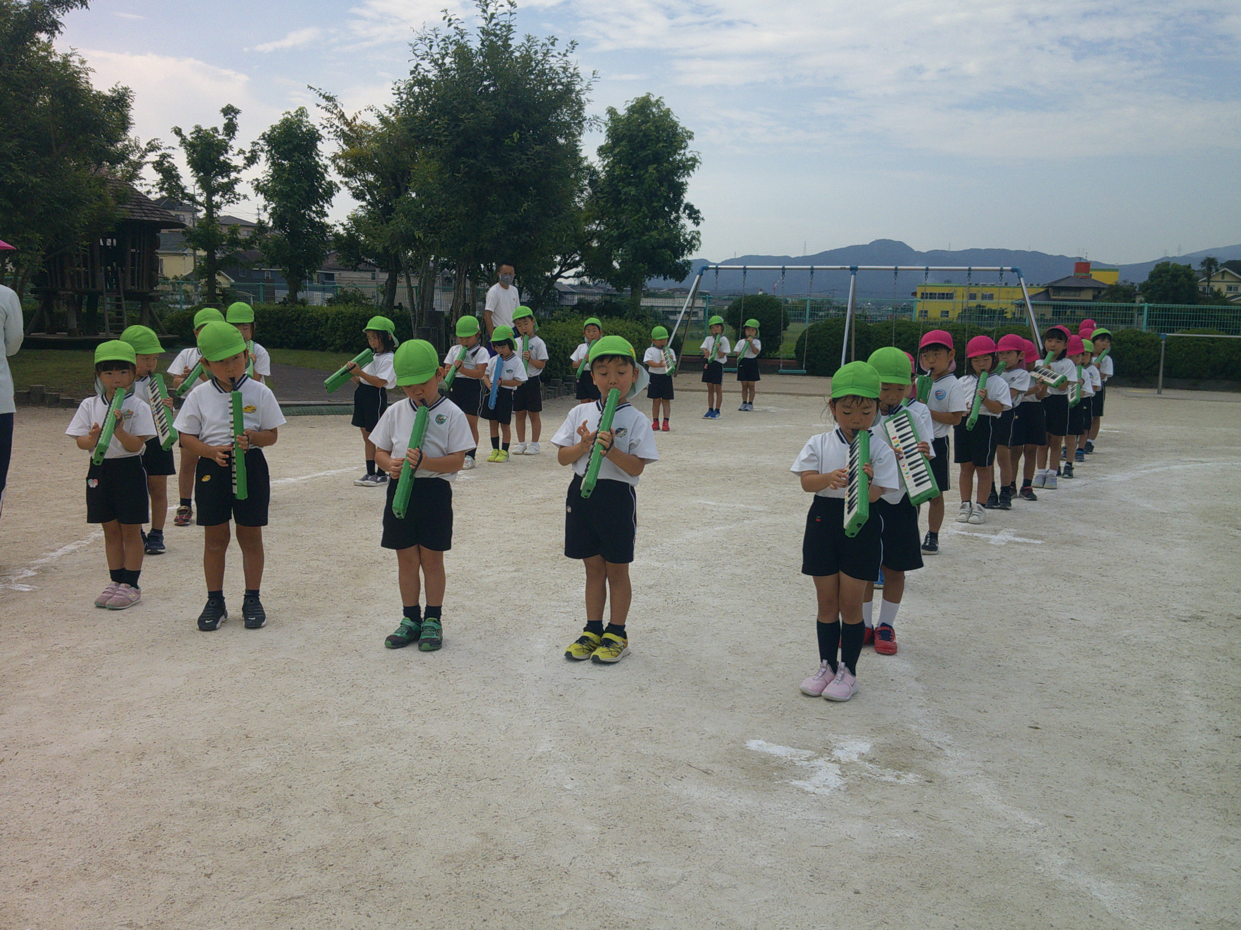 今日は朝から初めて楽器を持って外でマーチングの練習をしました!楽器を持っての行進、移動に戸惑いつつも練習を重ねるにつれて少しずつ覚えてきているところです!