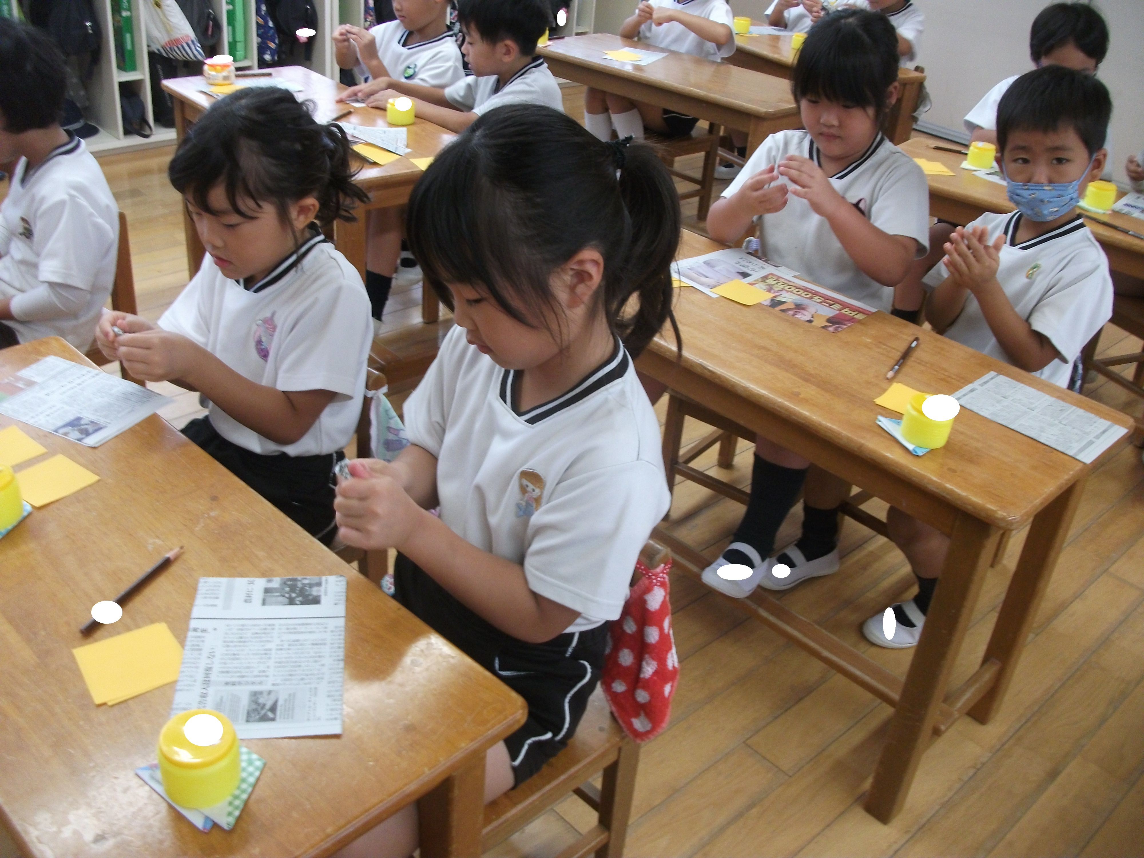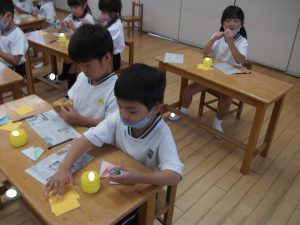 まずは新聞紙と折り紙でナゲット作り!形を作って上手に包ことが出来ました。