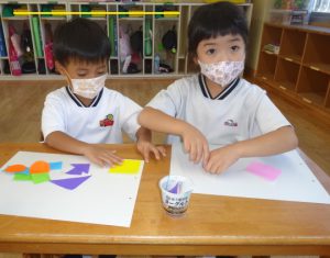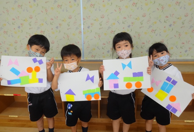 今日は、色々な形を使っての製作「じゆうこうせい」をしました。