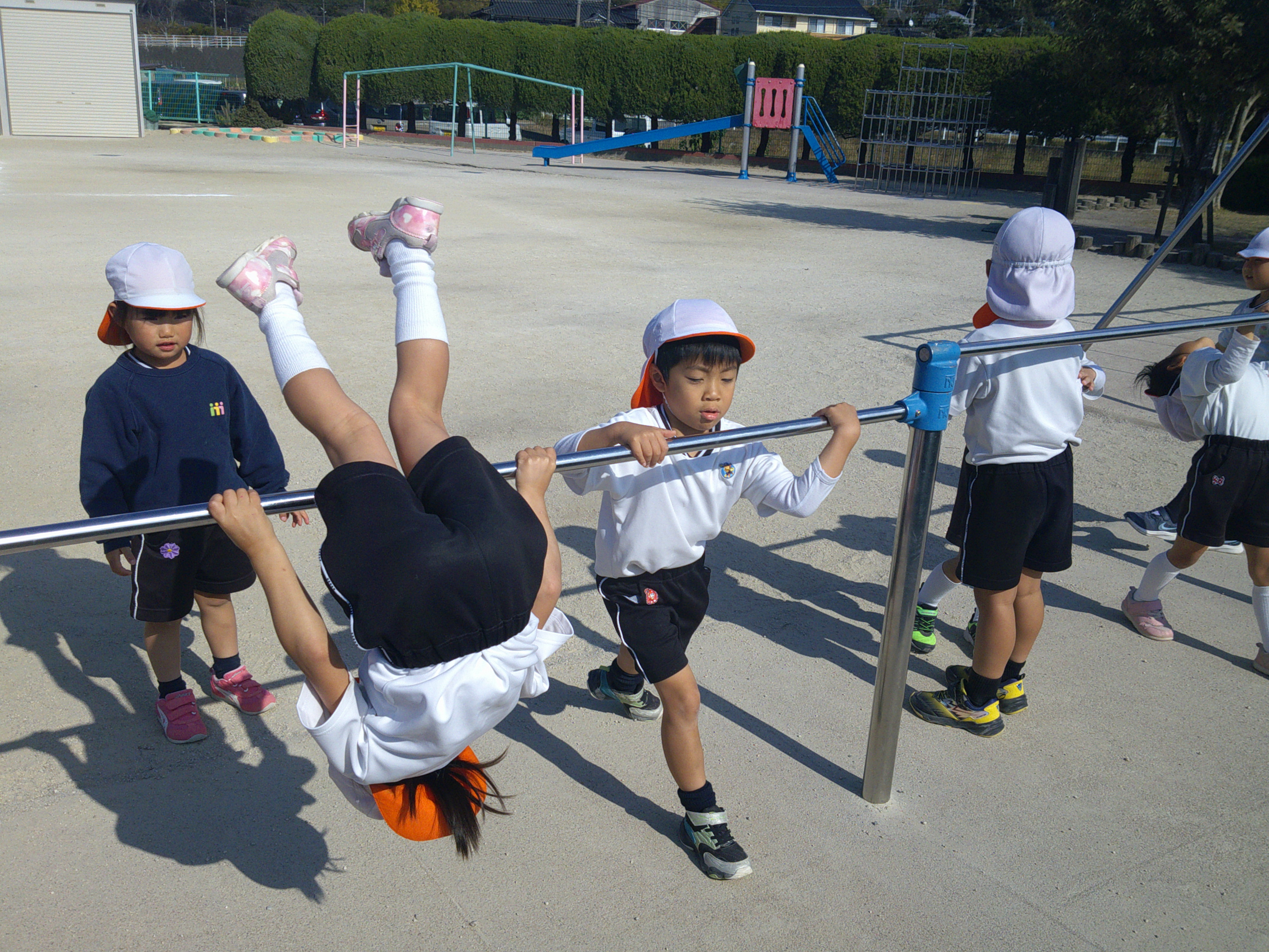 毎日いい天気が続き、外で縄跳びや鉄棒の練習を頑張っている年中さん。