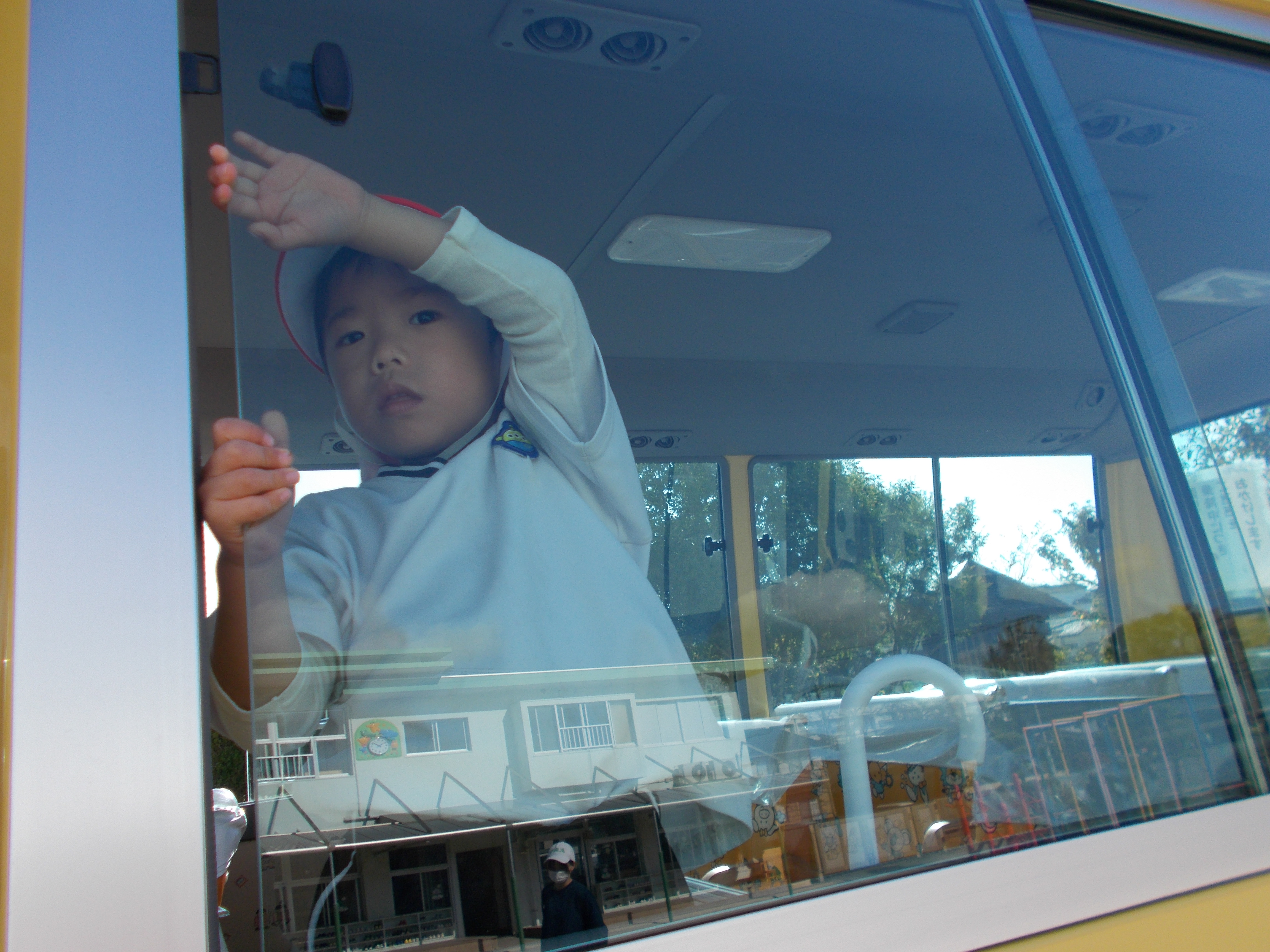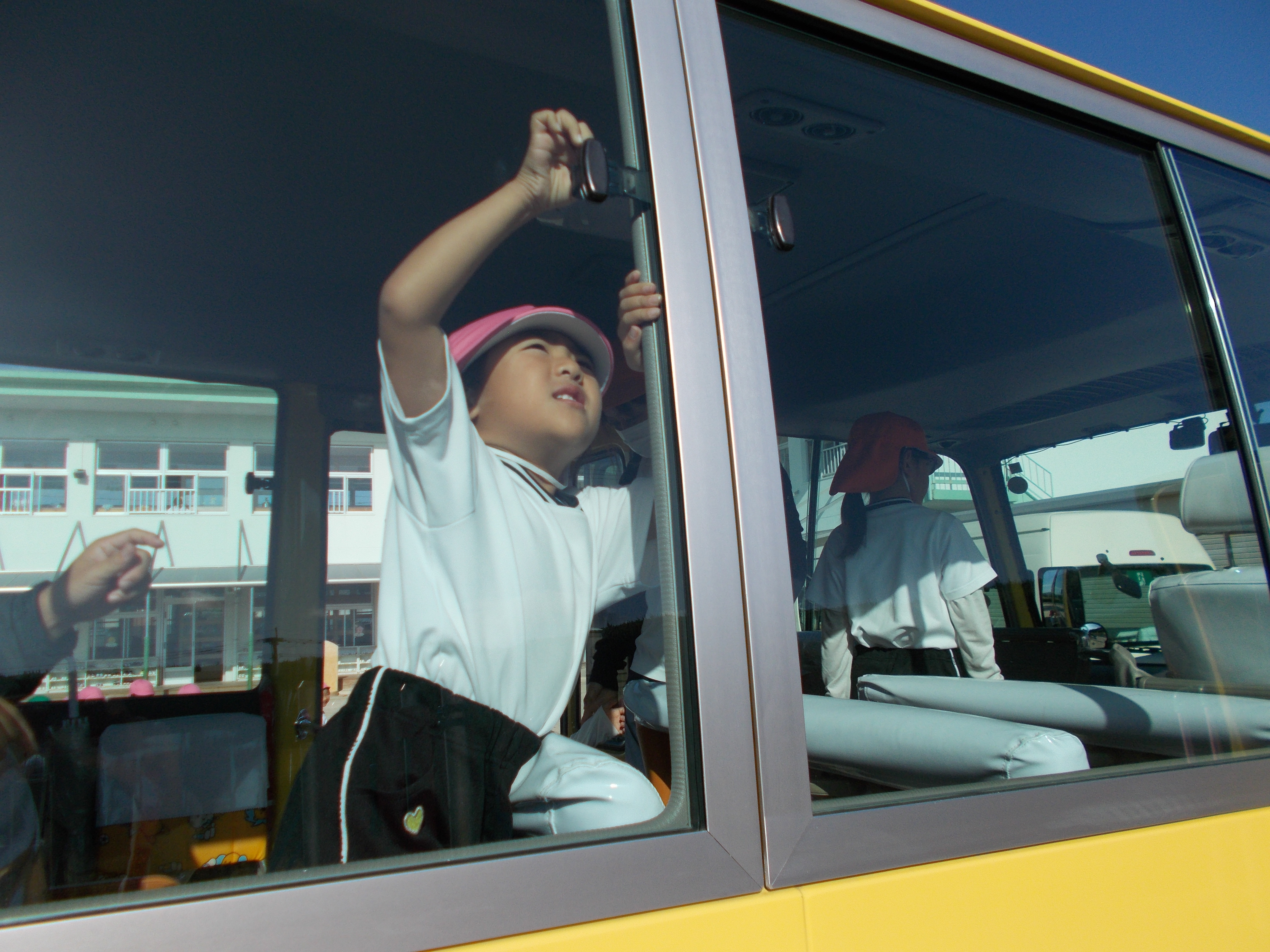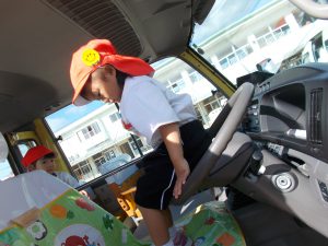 その後、実際にバスに乗って、窓・ドアを開けて「助けて~‼」と叫んだり、1人ずつクラクションを鳴らしました。