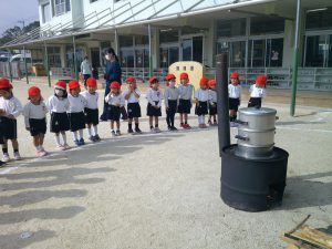 お芋が出来るまでの間、クラスごとにかまどや蒸し器を見て、説明をききました!
