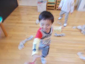 破った新聞紙を集めて、「せーのっ!」と新聞紙の雨☔😆✨