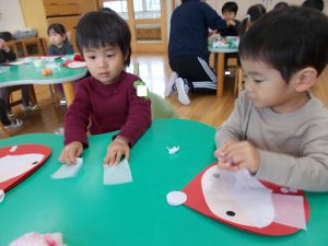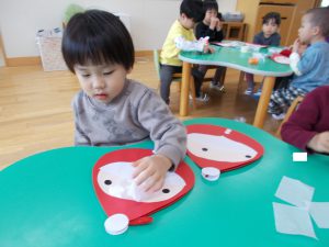 作り方の説明をしている中で、サンタさんのおひげを指差し「ここは何でしょう❔」と聞いてみると「マスクー‼」という答えが…😲❢❢