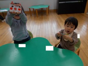くまの顔は、1人1箱ずつクレパスを受け取り、“目は、何色かな?” “口は何色かな?”とみんなで一緒に考えながら、進めていきました✏