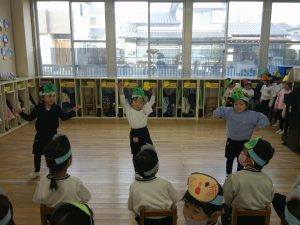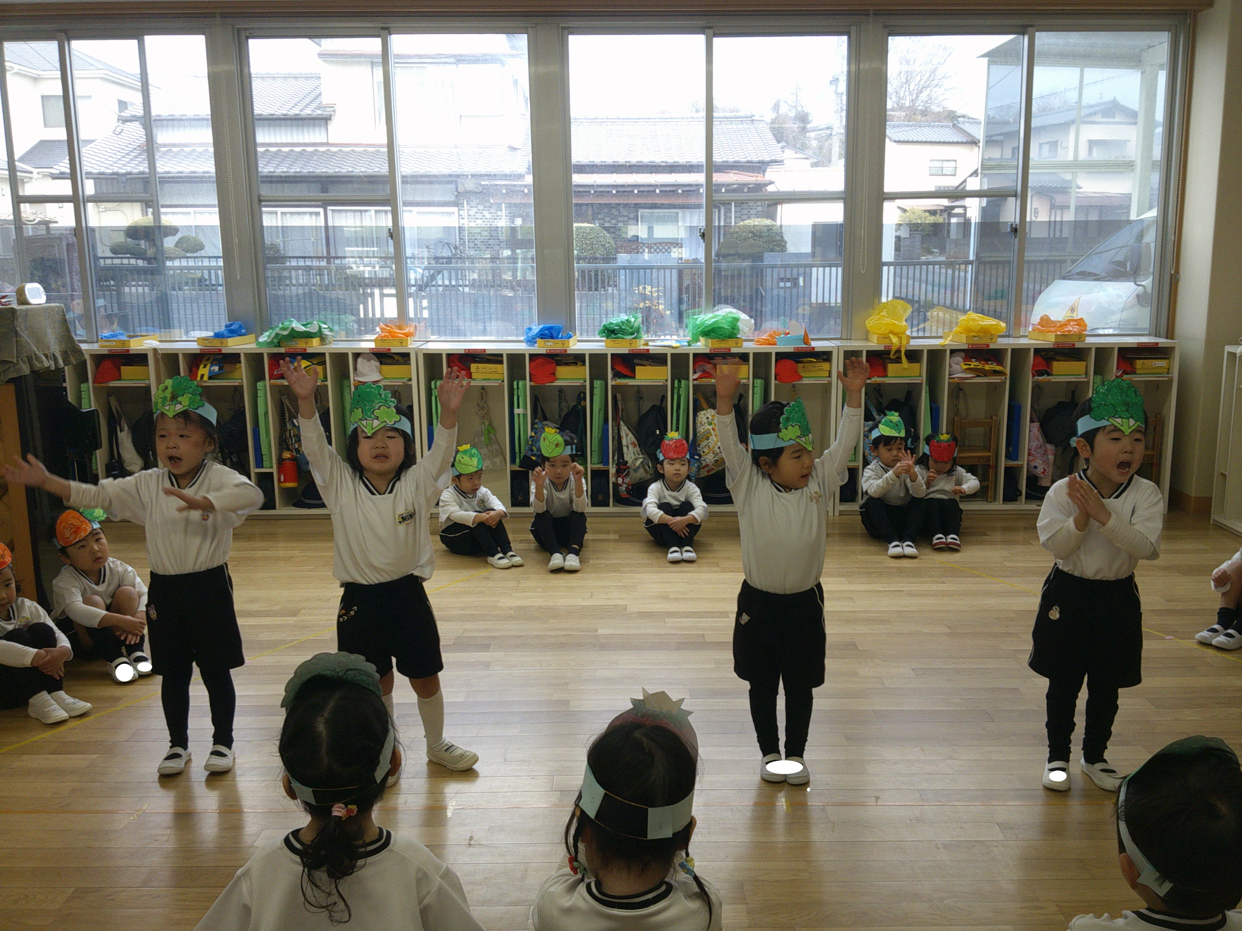 毎日、8日(水)の参観で発表するオペレッタ【やさいのパーティー】の練習を頑張っています!