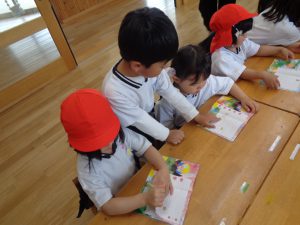ドキドキしながらもお手帳のシールの貼り方や、クレパスの使い方、片付け方など