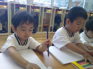 今日は、初めて色鉛筆を使ってお絵描きをしました。