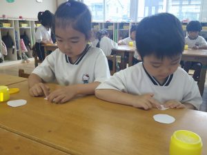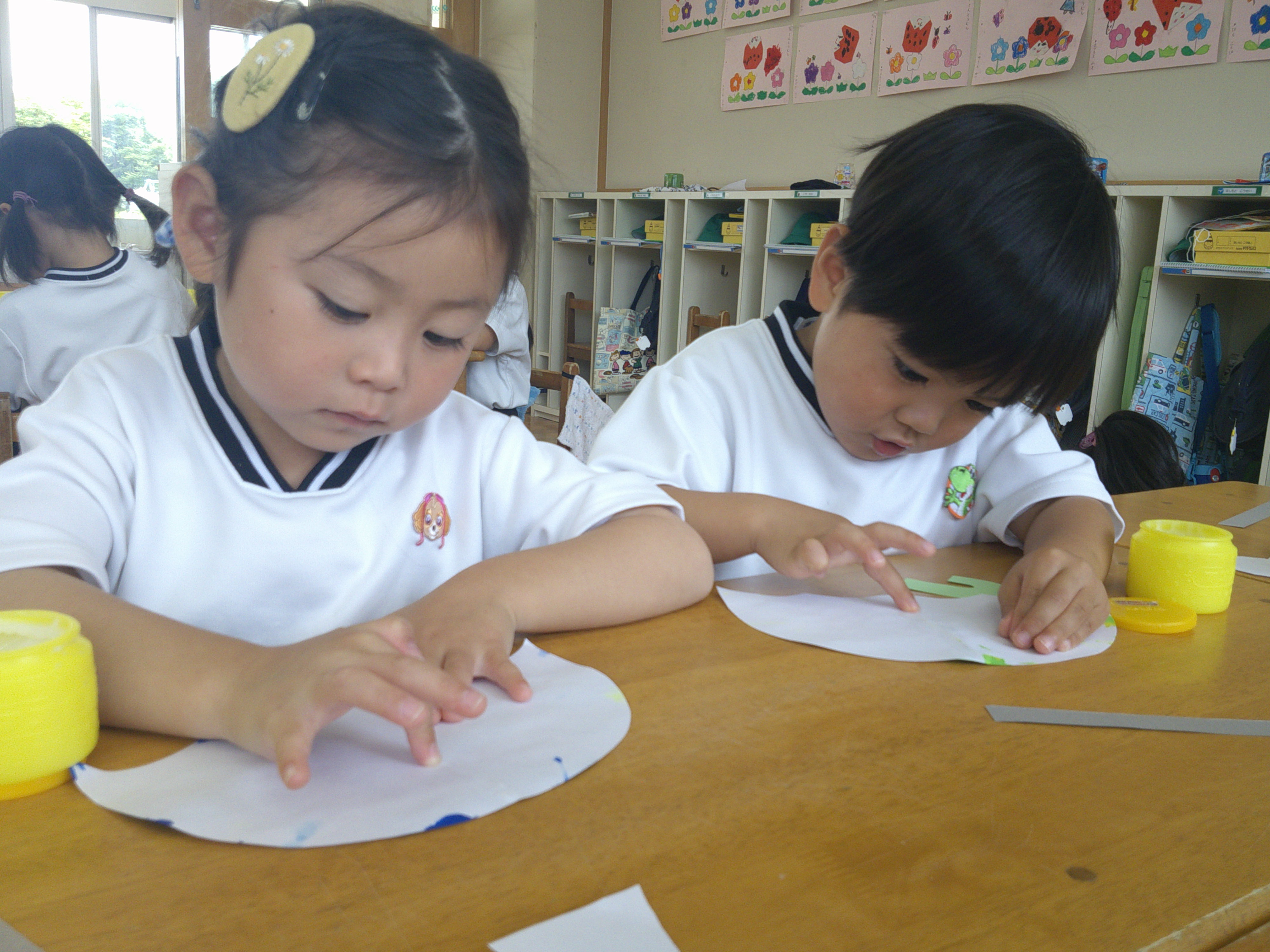 傘は初めて自分の絵具を使って模様を付け、自分の絵具を出すと目をキラキラさせながら手に取っていました(^^)