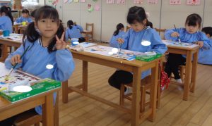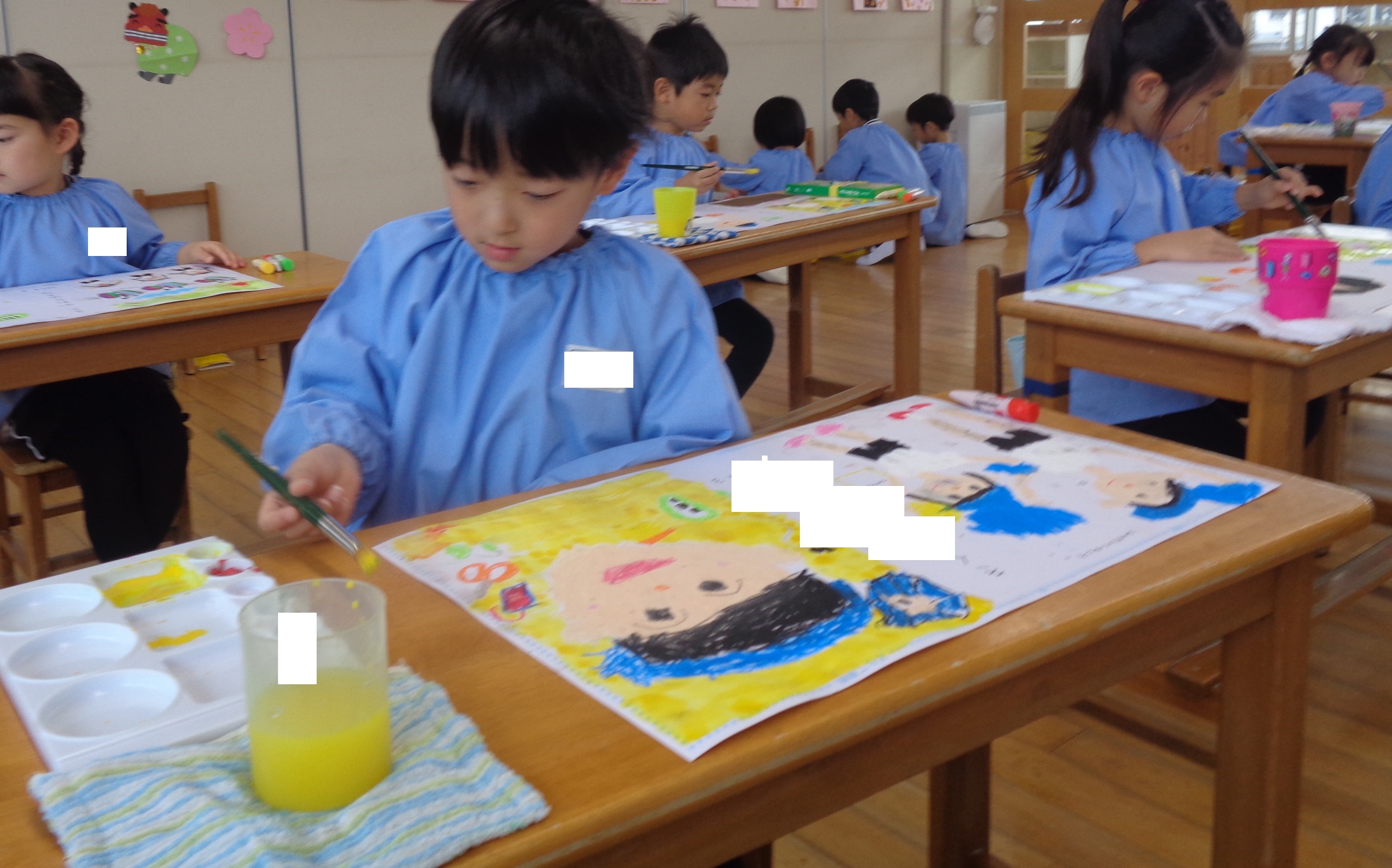 今日は、幼稚園での思い出の絵に、絵の具で背景を塗りました!