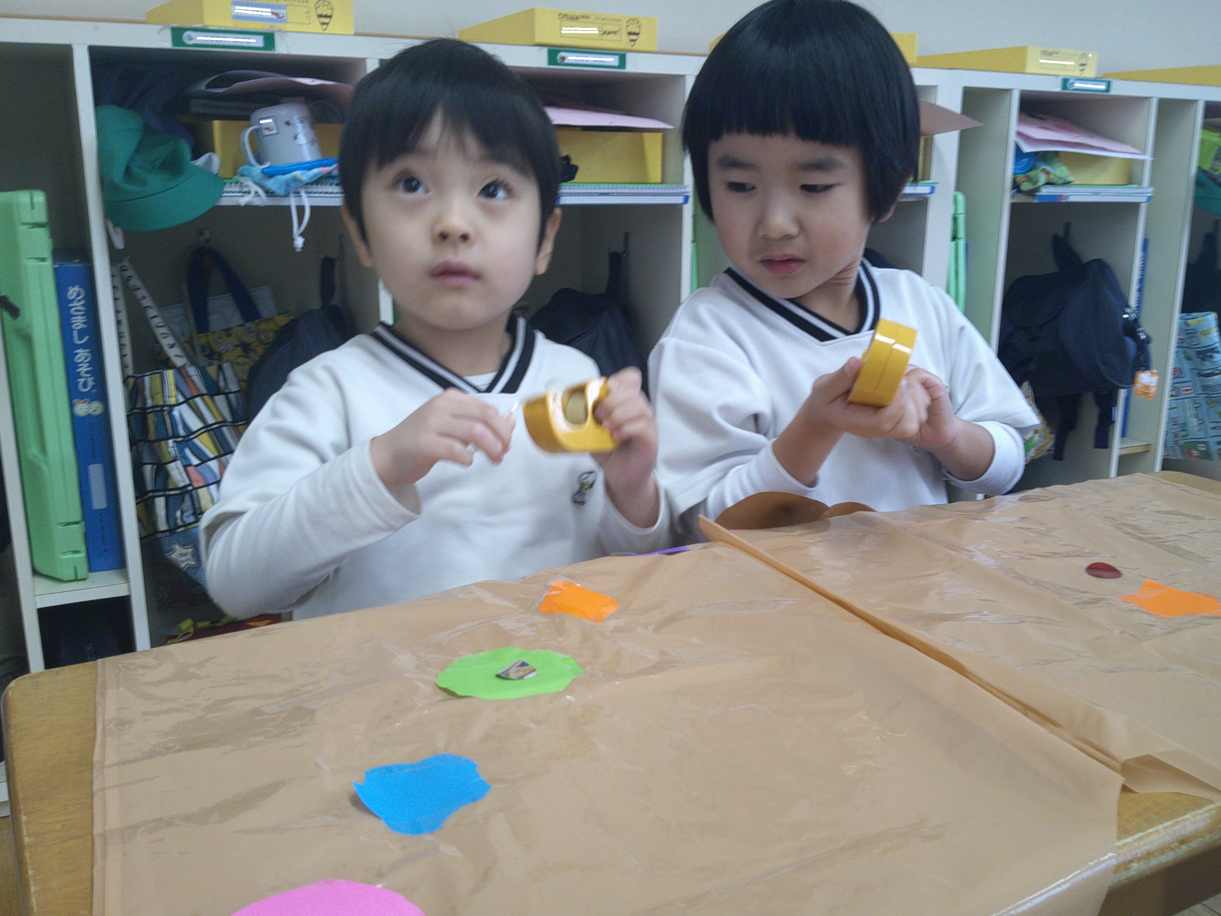 折り紙に型書きをして切るときにはクラスがしーん。となるほど集中して切り進めたり、貼るときには「衣装屋さんになる!」「おしゃれな衣装にする!」と楽しみながら作っていました(^^)v