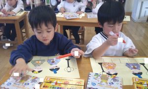 次に、お内裏様とお雛様にダブルマーカーで顔を描きました😄