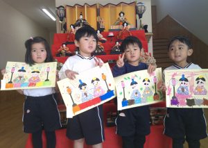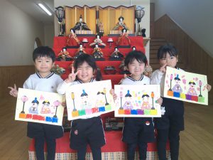 3月3日はひなまつり。園の玄関にもひな飾りを飾っています。昨日・今日でひなまつりの製作をしました。