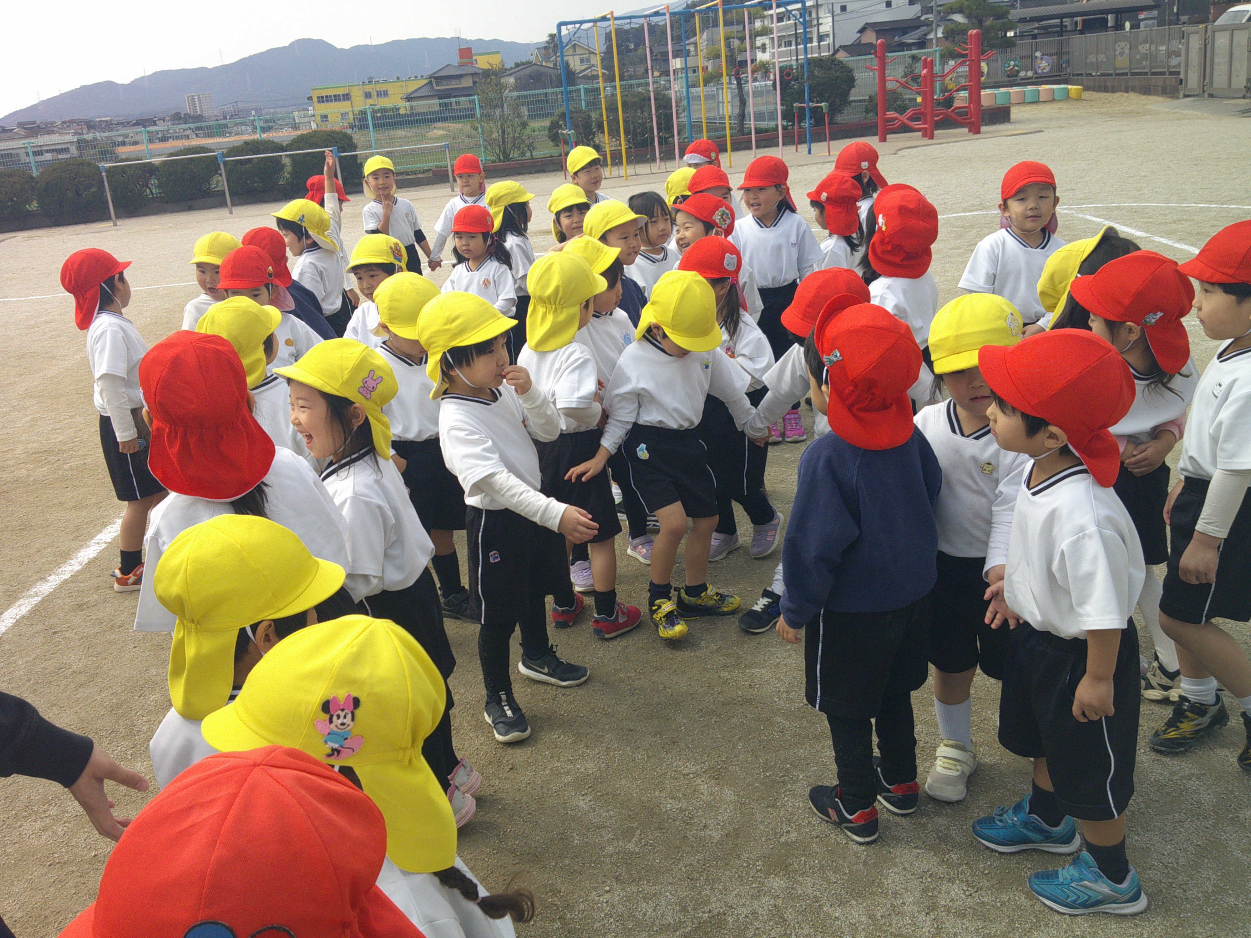 園庭で、ちゅうりっぷ組とたんぽぽ組の友達と2人組になり、カラー帽子を被ったカラーチームと、カラー帽子を白にして被った白チームの2チームに分かれてバトンを使ったリレーをしました🔥