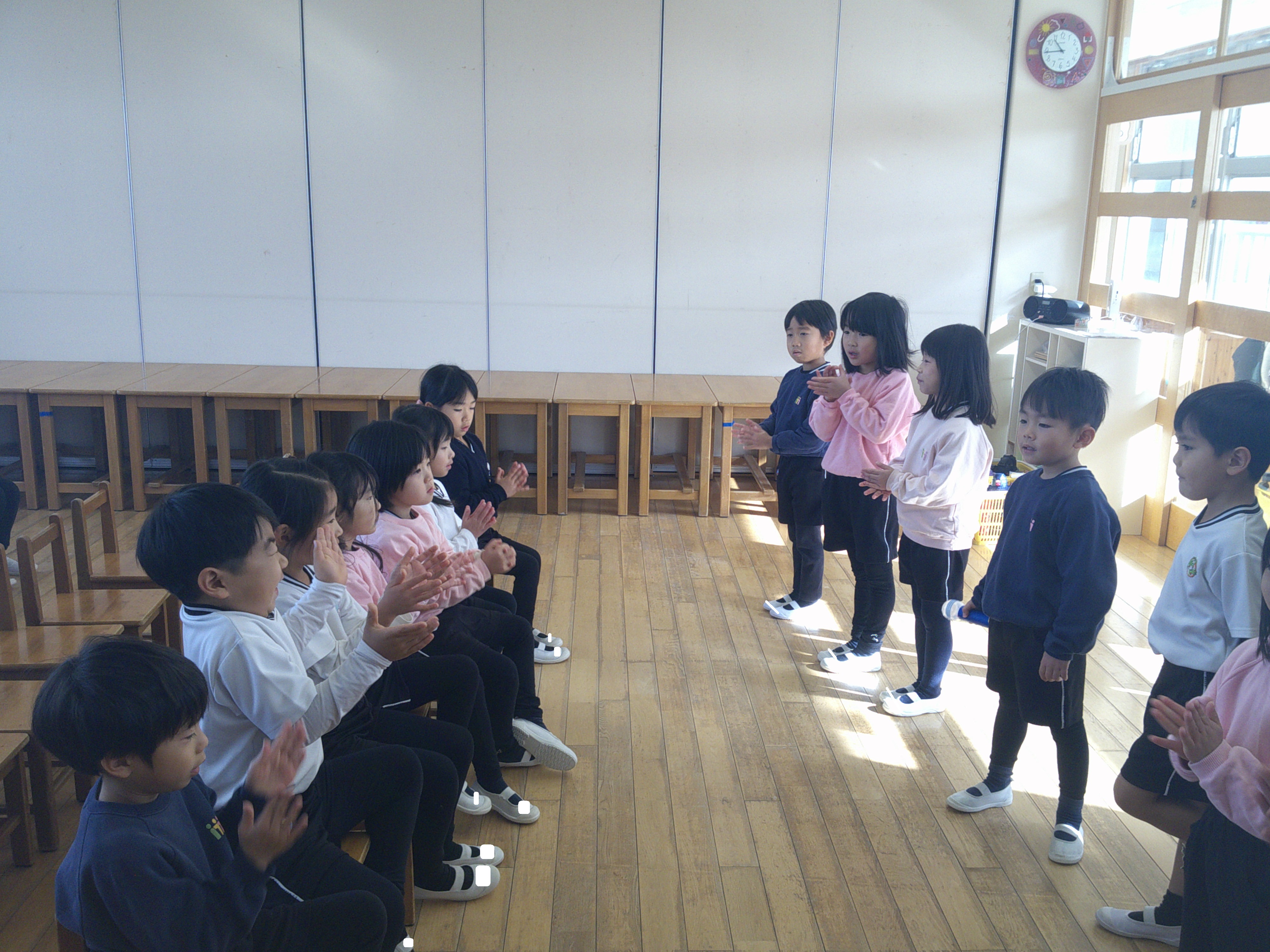 始業式では、園長先生と新年のご挨拶をして、3学期元気いっぱいに過ごせるようにお話を聞きました。