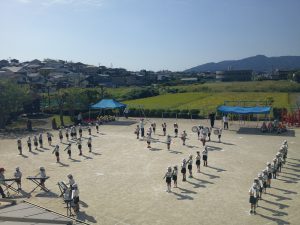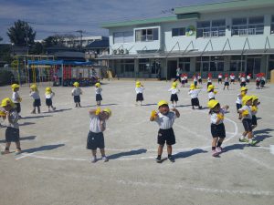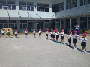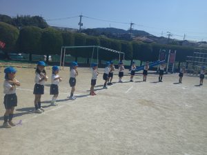 マーチング・楽器を持って、園庭を広く使っての隊形移動をしました。