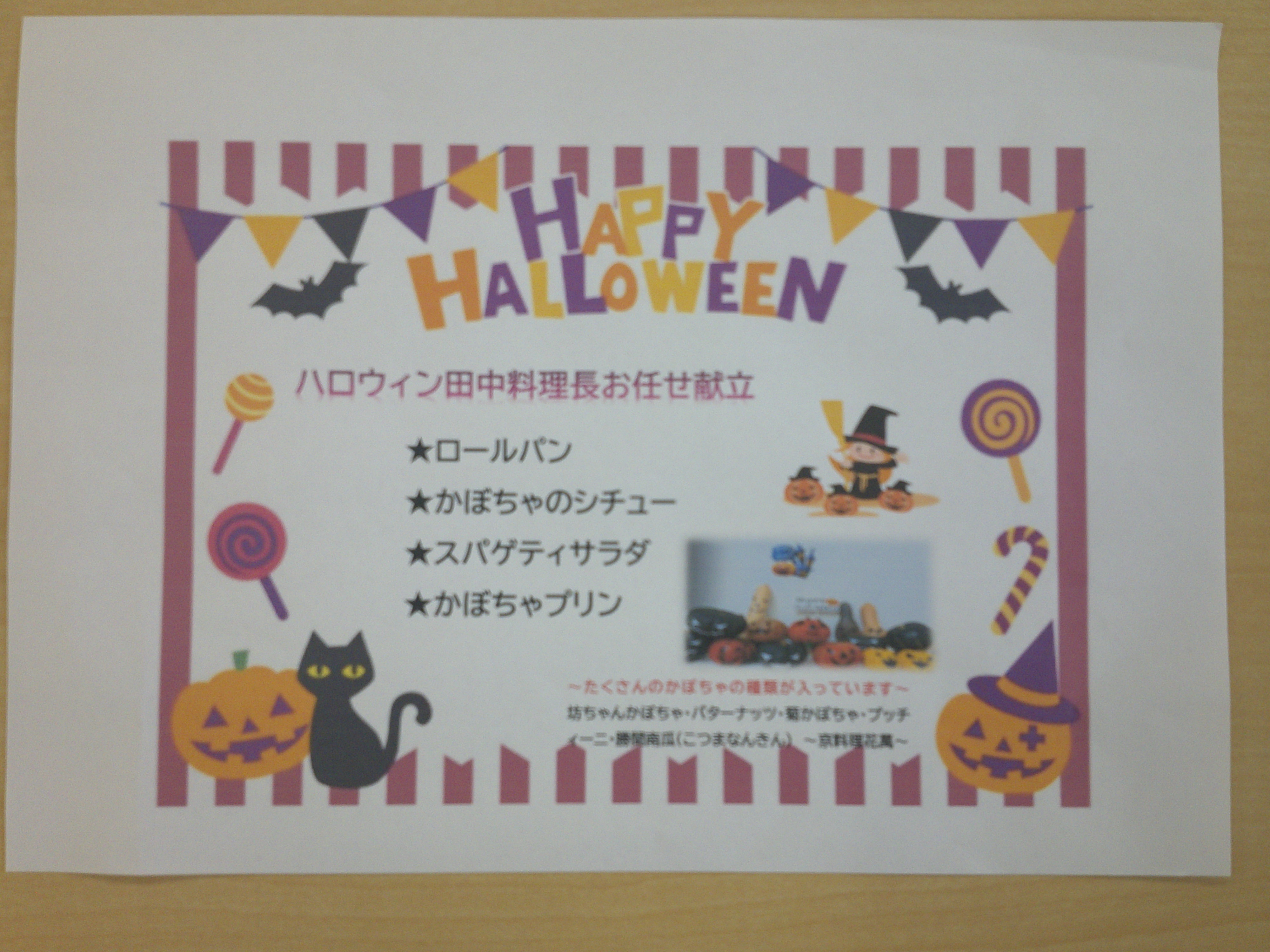給食センターの方が、一つひとつおばけの顔を変えて描いてくださり「見て!星の目!」「アンパンマンもおるよ!」と口々に自分のオバケを自慢していました!(^^)!