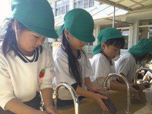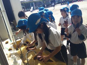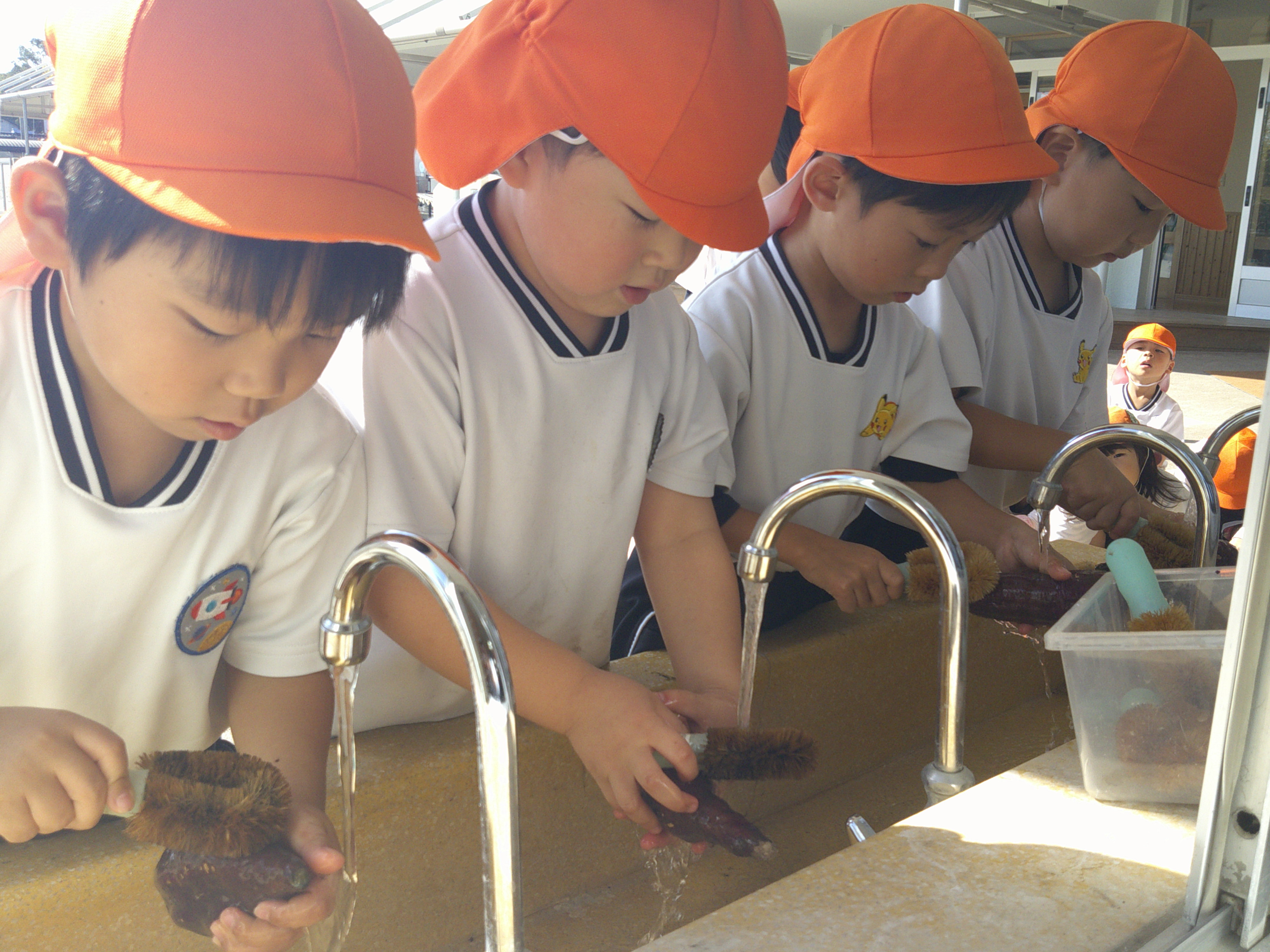 みんなが掘った、さつまいもを自分たちでごしごし洗って、芋パーティーの準備をしました!